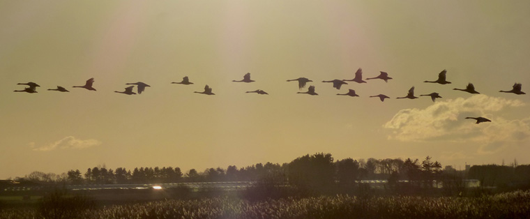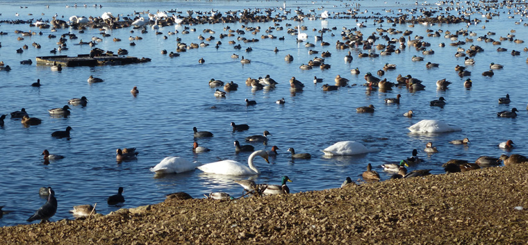 "Kingfisher" said Dave and a blue flash streaked in front of the hide from right to left. The bird settled on the fourth of six fence posts half submerged in the gravel pool. It flew to the fifth and then the sixth post before returning to the third post where it turned 360 degrees to show its salmon breast and its iridescent blue back. It darted down to the water once or twice before it settled on the second post and then it was off .....all in the space of about ten seconds! Ten white spoonbills treated us to some formation flying, splitting into a four and a six before joining up again (a bit like the Red Arrows!). They landed nearby on a spit of land like a pack of dazzling snowy white angels. |