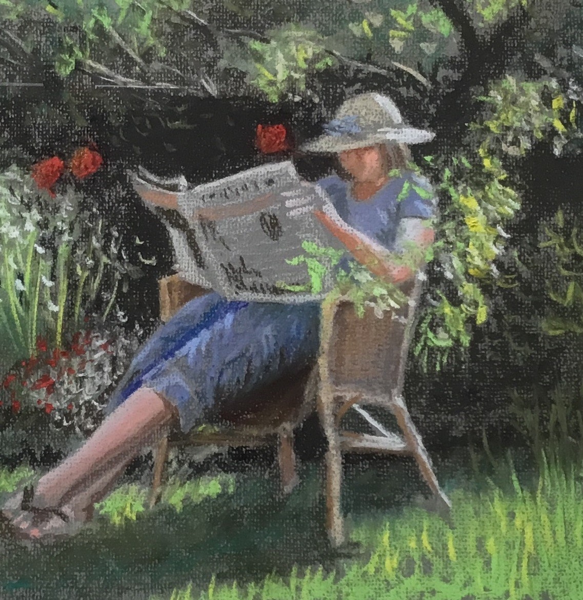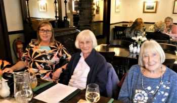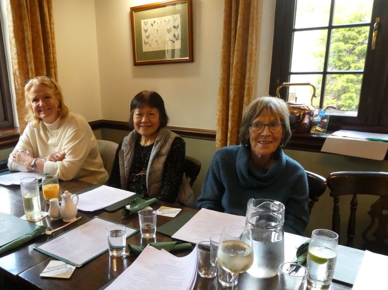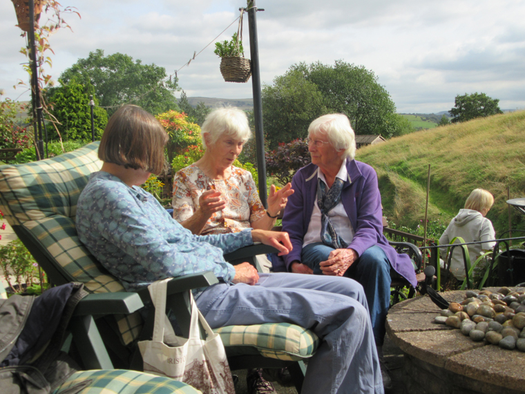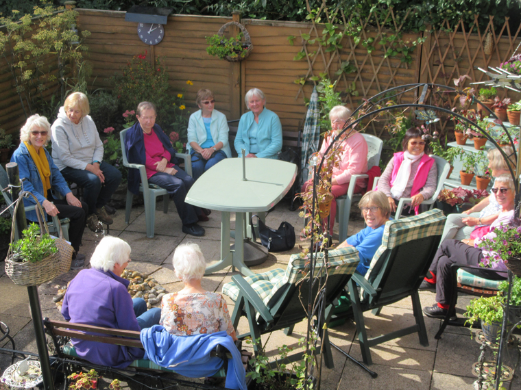 Group enjoying last of the summer sun in Barbara's garden. Margaret has obviously grown something very large. |
