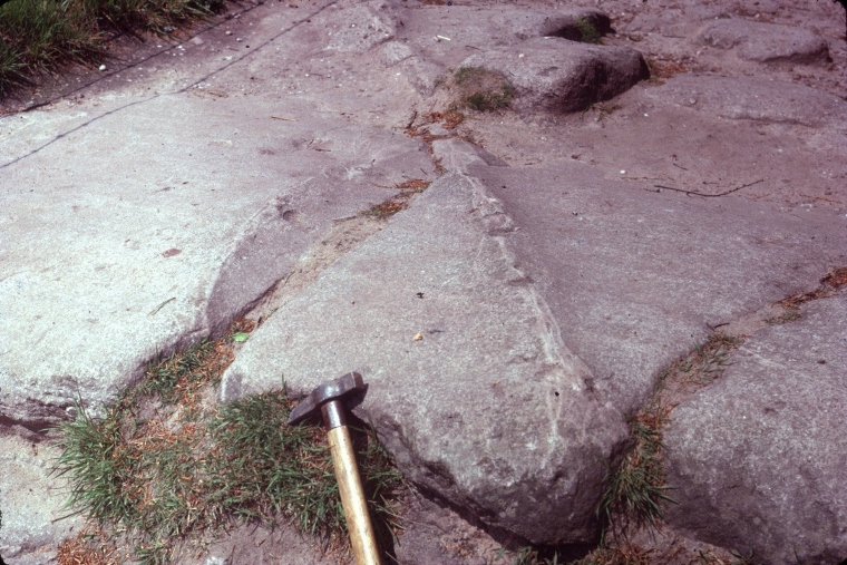 7. Castle Rock Engine Vein Conglomerate standing above the softer Wilmslow Sandstone. Here you are standing on the dip slope of an anticline, which rises towards the north. Pete Webb, who is a consultant geologist (former school student of Derek's!), described how the bedding could be distinguished from water deposited sediments. Examine the Wilmslow Sandstone in the cliff below, where the junction with the Engine Vein Conglomerate is well seen. These sands are aeolian deposits (wind blown). |
