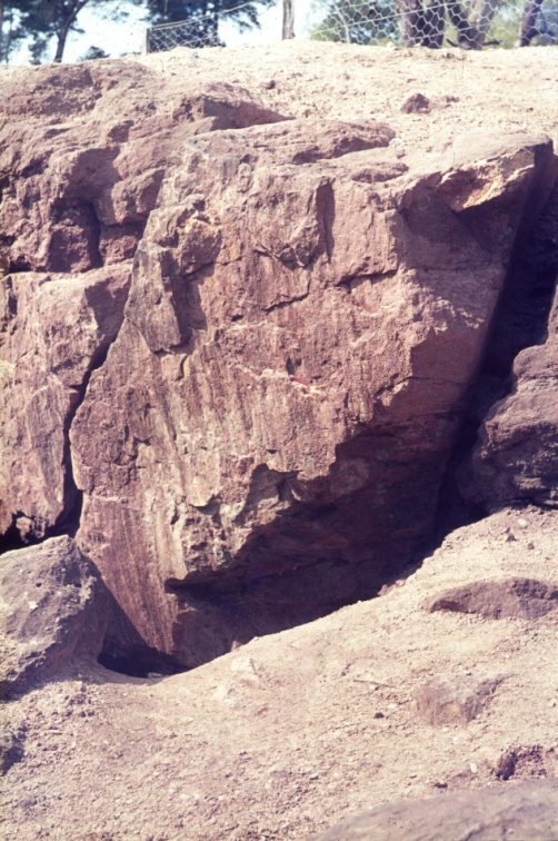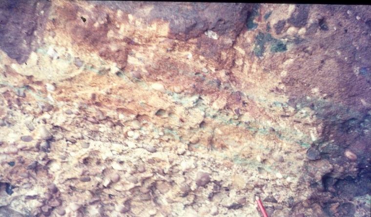 5. Doc Mine 'Devoid of Copper' has been suggested! The sides of this mine entrance show the sandy strata dipping south followed by the floor of the mine. The impregnation of the sand grains by the copper mineralisation (a secondary deposit) is well shown here at the mouth of the mine. |