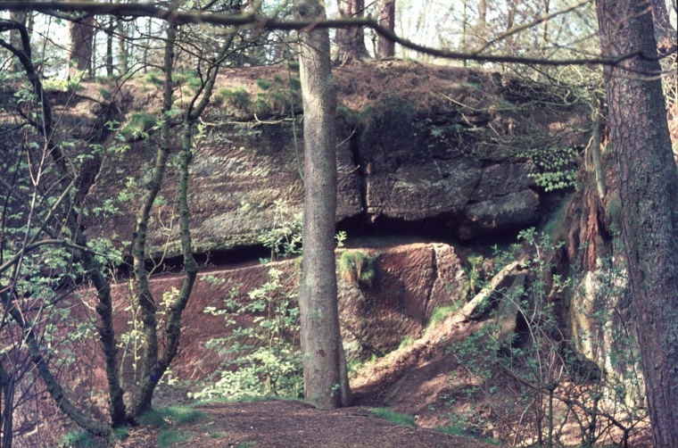 6. Pillar Mine Named after an isolated pillar of sandstone which was destroyed some decades ago. The mineralisation includes a black mineral, asbolite, a cobalt-nickel ore. The rock here is the Wilmslow Sandstone Formation, beds of variegated coloured fine sand. It lies stratigraphically under the Engine Vein Conglomerate, which here has been dropped down on one side to the same level by a landslip. |