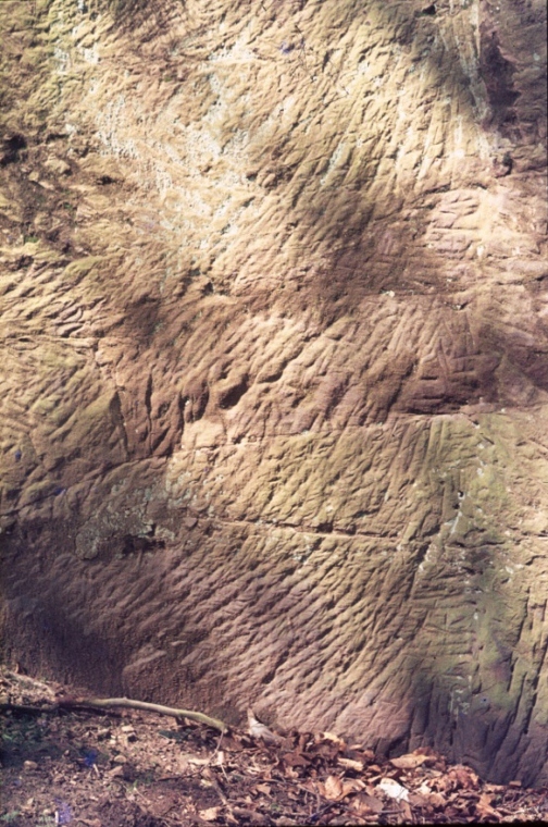 2. Old Alderley Quarry This interesting abandoned quarry shows several geological features of note. Higher in the succession, the rock is a sandstone, fairly free of pebbles and has been quarried to be used as building stone in the Alderley Edge area. A small fault shows a marl (mudstone) bed downthrown to the north which has been followed by the roots of a tree. The fossil Euestheria ( a shrimp) has been found here. The face of the rock is covered in pick marks, where the quarrymen have followed a line of weakness or joint to free up large blocks of sandstone. This quarry is a good location to demonstrate true dip and apparent dip, for looking along the strike the bedding of the rock shows a true dip of about ten degrees, but on another face at right angles it looks horizontal. | |