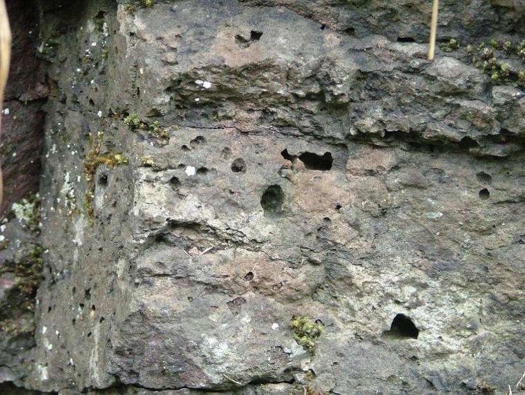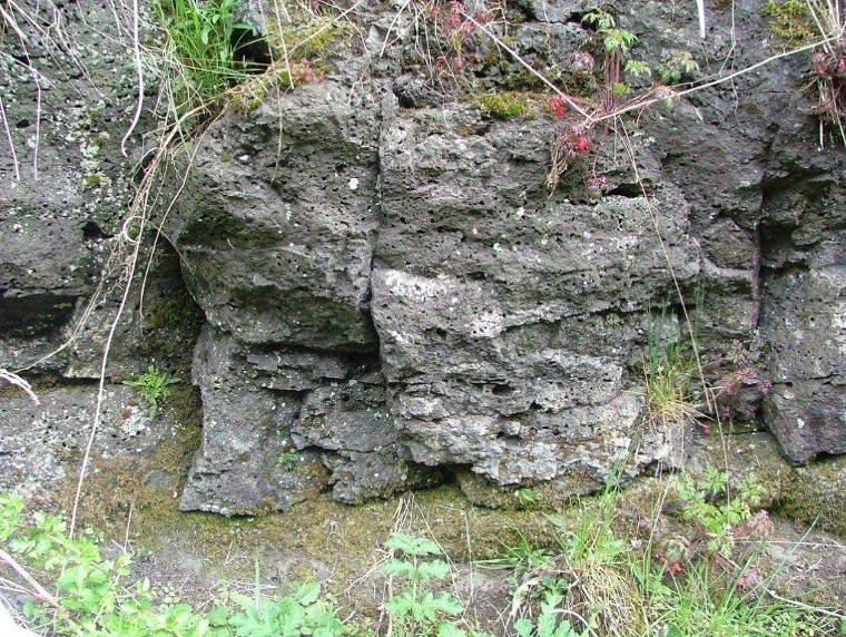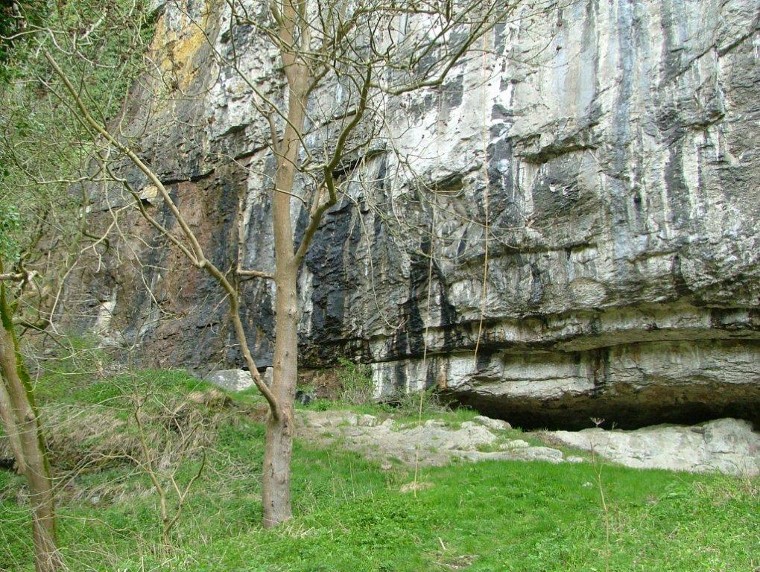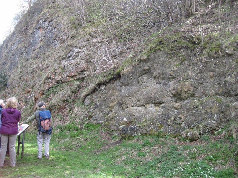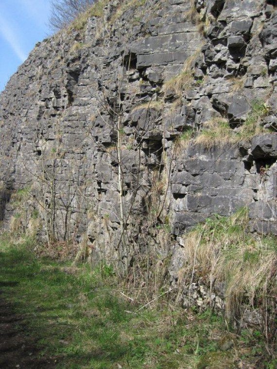 Locality 2. Ravenstor. This imposing limestone rock face (popular for rock climbers) is marked at its base by a cave. The floor of this cave is formed by the irregular top of the lava flow, which has weathered into a soft clay and its erosion is partly responsible for the creation of the cave. |