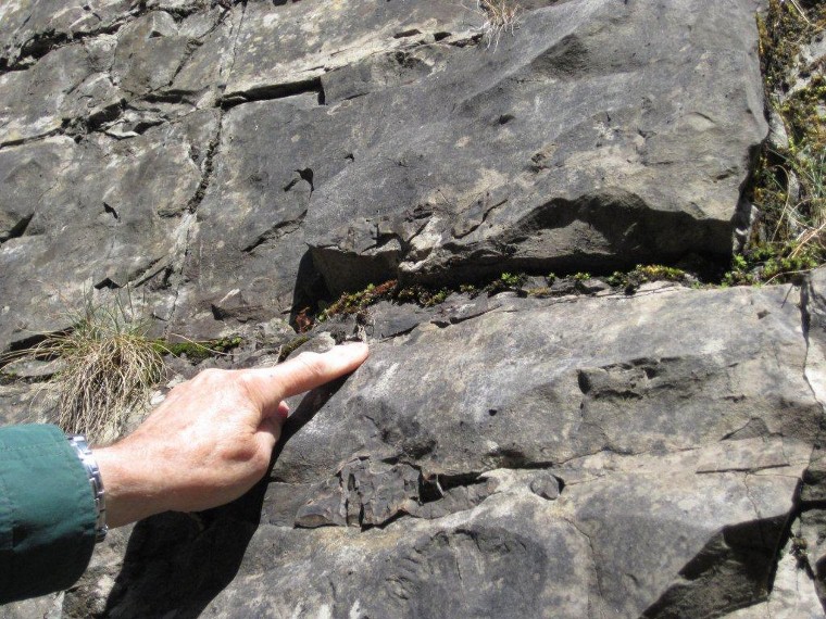 Locality 3. Roadside outcrop of the Miller's Dale Limestone. This limestone is marked by distinct bedding planes (horizontal divisions between the limestone beds) which on investigation are seen to be filled with a thin clay. This clay has been identified as volcanic ash, recording the eruption of a local volcano at the time, interrupting the deposition of the limestone. These ash layers are very widespread in the region and are known as wayboards, a quarryman's term. | ||