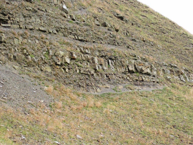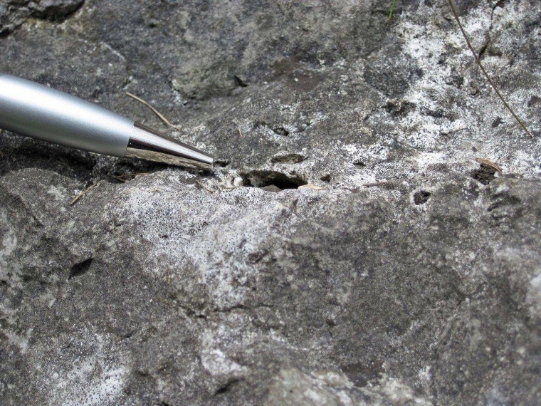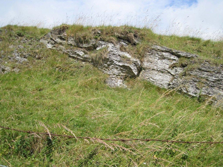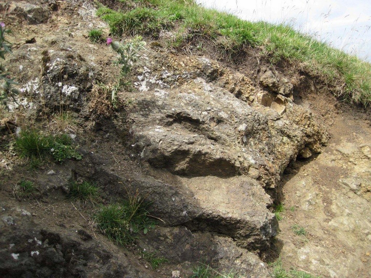 Outcrop of volcanic rock. The group then took the cars down the Winnats gorge to the car park opposite Speedwell Cavern. From here, a path lead across fields in the direction of Castleton to the next locality where the leader pointed out a discrete triangular-shaped piece of land which appeared to have resisted erosion. Some small outcrops exhibited a crumbly brownish rock, obviously not limestone. Derek explained that the rock was volcanic and had been deposited and fragmented in water, probably at the same time as the basalt which can be seen in nearby Cave Dale. |
