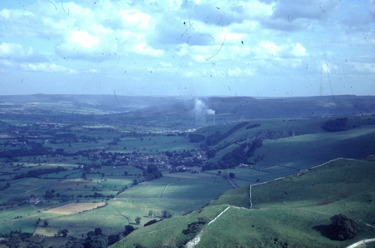Treak Cliff. The wide vale of Hope, underlain by the Edale Shales (a mudstone) emphasised the contrast with the steep limestone cliff, which is a former coral reef (apron reef), formed about 350m years ago, which sloped down into the deep water in which the Edale Shales were being deposited. This submarine cliff was buried by the onset of deposits of the Millstone Grit delta from the north and is only seen today because it has been re-exposed by tens of millions of years of erosion. |