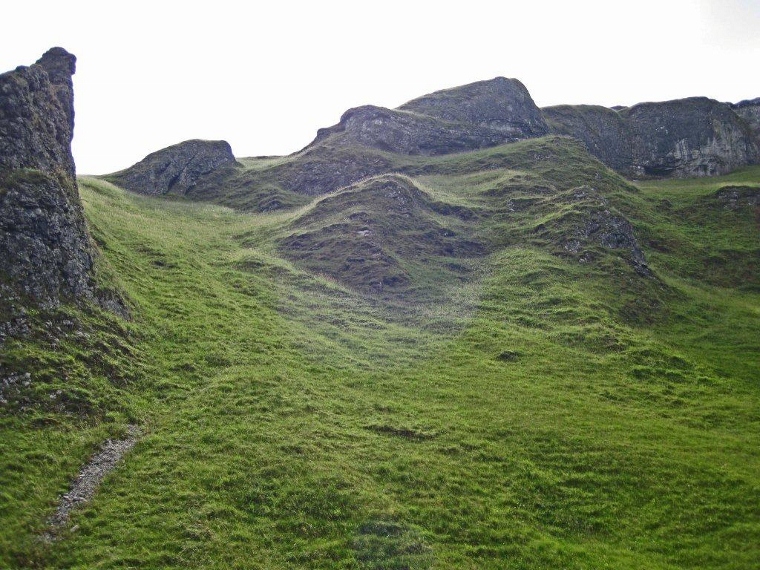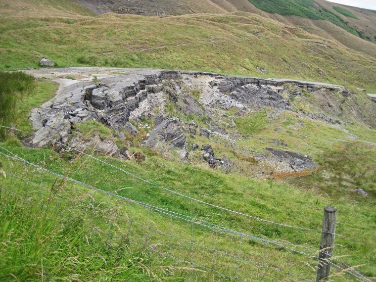 From this location there is also is a dramatic view’ of the Mam Tor landslip, the largest active landslip in the country, at least 3,600 years old. The road was built as a turnpike in 1810 to replace the steep Winnats Pass road. This turned out to be an unwise choice. Due to movements of the slip, repairs were made in the 1940s, 1960s and 1970s, with repeated filling and levelling. But massive movement finally destroyed the road and it was closed in 1979, never to be reopened. Walking over it is an extraordinary experience for the successive layers of tarmac, oldest at the bottom, are a perfect example of the principle of geological succession, while the various separated blocks illustrate mini fault scarps. |