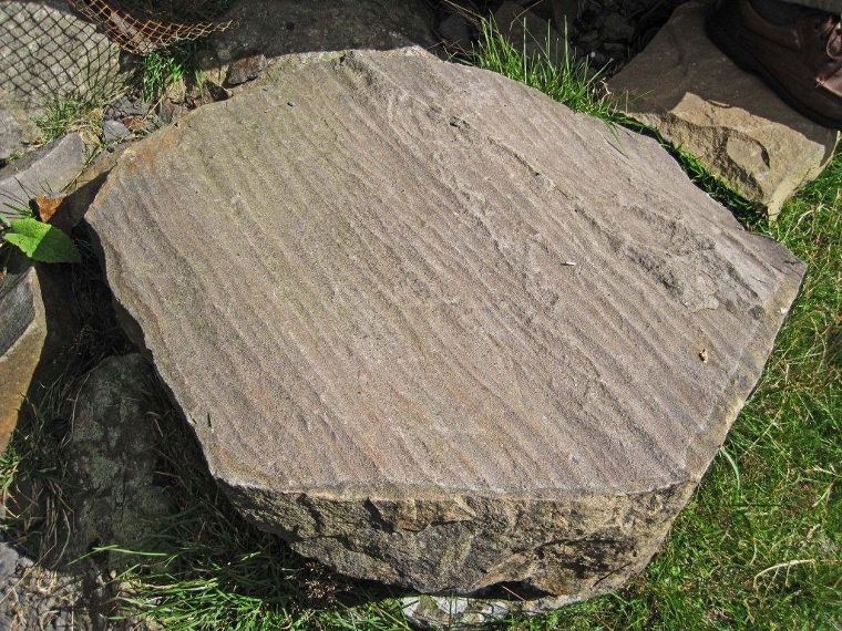 Sole marks on the base of a sandstone block. The party walked to inspect the fallen rocks below the face of Mam Tor and Derek pointed out several blocks of sandstone, explaining how these illustrated the ancient turbidity currents. Several bedding planes showed sparkling flakes of mica, proof that they were derived from the igneous and metamorphic rocks making up the mountains to the north. |