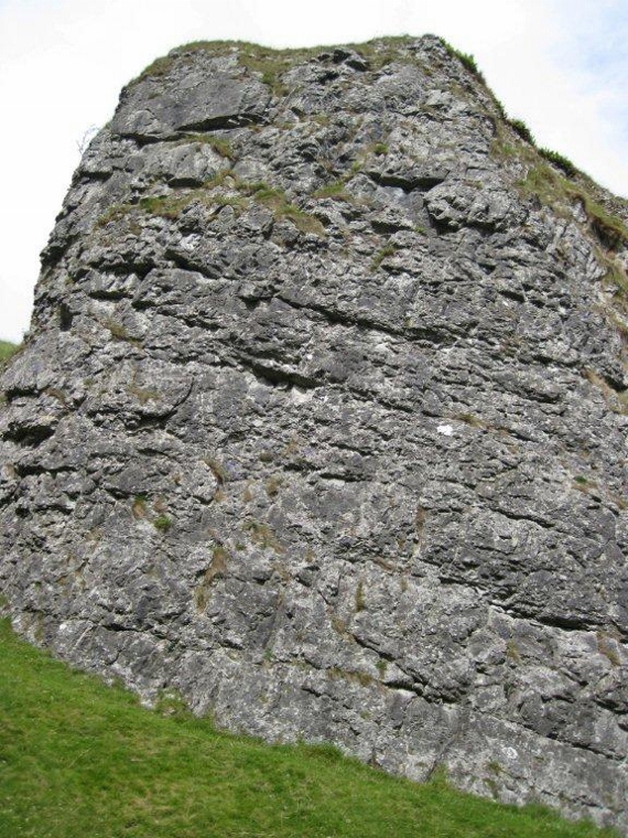 Back at the car park, a view towards Treak Cliff Cavern showed a limestone crag jutting out from the cliff face. It was explained that studies by Fred Broadhurst and a colleague showed that the geopetals in this crag were upside down. The crag therefore was not part of the cliff face, but were huge boulders that had slipped down and turned over during the formation of the reef. |