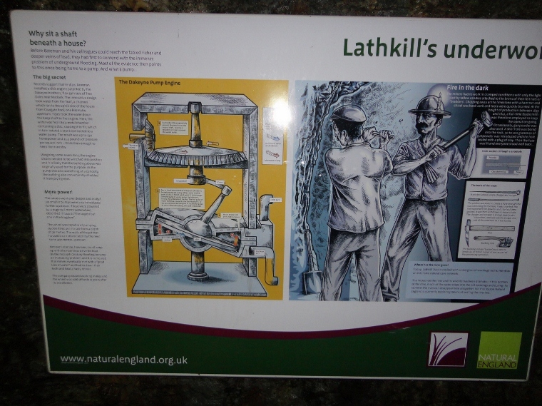 Bateman’s House (13). Bateman was the agent for the Lathkill Dale Mining Company and this building was built in 1830 over a shaft which had an unusual water turbine pump (a disk engine patented by the Dakeyne brothers) for draining the mines upstream. It worked until the 1860s. So much water is still removed today from the limestone that it contributes to the drying out of the river. Climbing down into the shaft, with the aid of a ladder, one can turn the handle of a generator which lights up the sough (tunnel). The pump has long since been removed but there is an interesting board describing what it was like and how it operated. The site has been cleared and re-opened for public access by English Nature. |