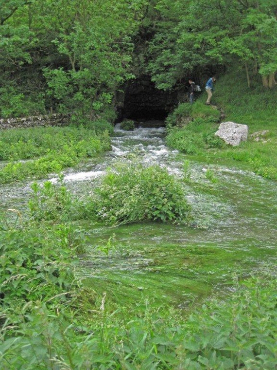 Lathkill Cave (5). The first part of the dale consists of an extraordinary narrow, rocky limestone gorge, very difficult under foot, the sides of which show evidence that it was eroded by water. The date of this is uncertain. Beyond the gorge, the path led past beautiful patches of ‘Jacob’s Ladder’ (the dale is famous for this blue wild flower) leading to Lathkill Cave. As a result of the recent very wet weather, a huge stream of water (the source of the river Lathkill) was pouring out of this cave draining the limestone upland for miles around. In dry weather, however, when the water table is low, this cave is dry and water does not then appear until further down the dale at Sheepwash Bridge (6). David Sims gave us an account of exploring this cave and its system. |
