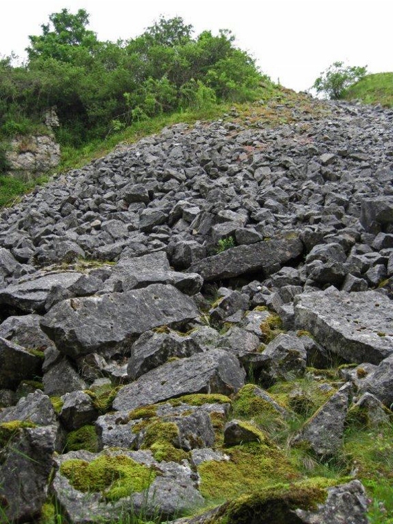 Large amounts of waste stone were tipped over into Lathkill Dale making vast screes characterised by the largest boulders being at the bottom. There is a superb view of Lathkill Dale from the top of one of these screes, which tumble down into the dale. |