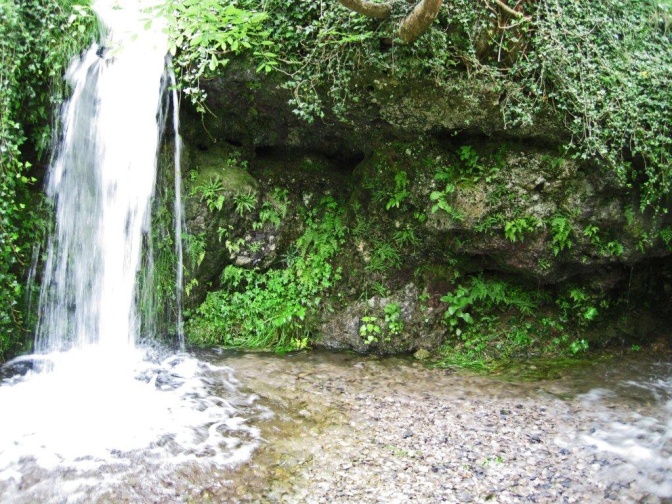 Tufa Waterfall (7).This waterfall is encrusted with a thick bed of tufa formed by the precipitation of calcium carbonate from lime-rich water. The tufa encrusts the leaves, stems and moss growing on the waterfall. Tufa is a form of travertine which is often found forming banded deposits in freshwater lakes, and can be used as attractive ornamental stone (eg the entrance floor of Manchester Art Gallery in Mosley Street). |