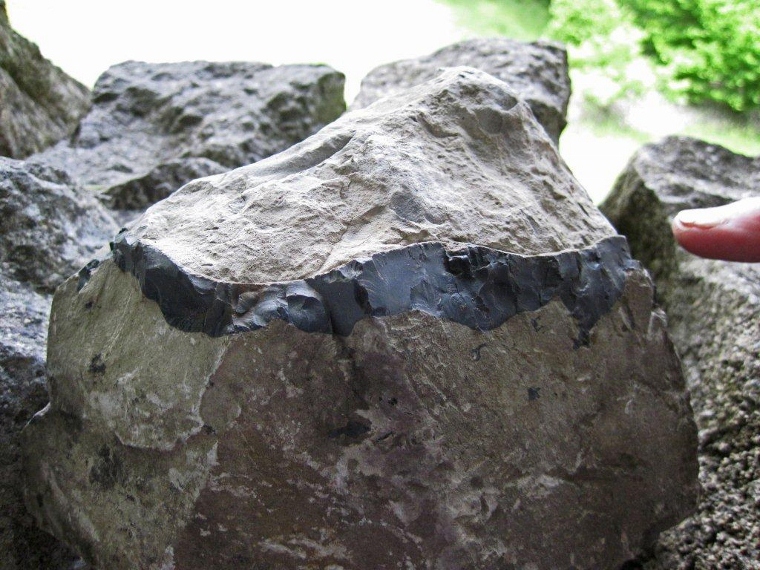 Mill Dale (9). This is a small tributary valley from the north and along it are fine quarried outcrops of the ’dark’ Monsal Dale Limestones. Derek explained that these limestones are among the youngest in the Peak District, the limestones, for instance, of Millers Dale and Tunstead being underneath us. The ‘dark‘ refers to the fact that the limestone has layers of chert, a black, extremely hard substance made up entirely of silica. Its origin is somewhat obscure, but it is thought that it is probably derived from the breakdown of millions of tiny siliceous microscopic animals called Radiolaria which lived in the Carboniferous seas. Somehow, this silica migrated into nodules or, as here, in bands, being deposited after the formation of the limestone. It is very similar to the flint of the Chalk, which is distinguished by the fact that it fractures in a coinchoidal nature, whereas chert has flat fracture. |