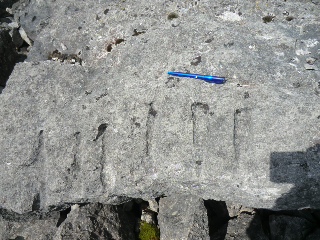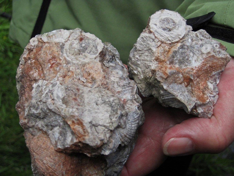 Two boulders (19). After passing two trial mine adits, the end of the trail is marked by two large boulders on which surfaces there is a fine display of many Gigantoproductus a fossil brachiopod. Derek explained that this shell bed was a death assemblage and in some cases, when seen in section, the shells are piled up on top of each other in a concave-up position like a pile of saucers. |