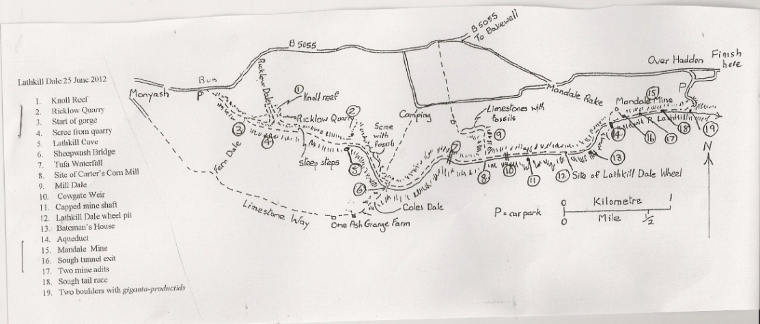 On 25 June, 25 members of the two geology groups led by Derek Brumhead visited Lathkill Dale, a mile east of Monyash. The dale is over 4 miles long so a coach dropped us at the beginning and picked us up at end of the trail at Over Haddon. A selection of localities is described here. |